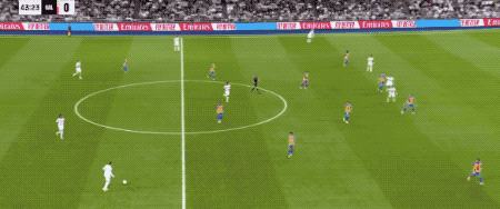 第43分钟,贝林厄姆在禁区线附近连续盘带,突然起脚,皮球直钻死角,皇马半场结束就已经3-0领先了。
